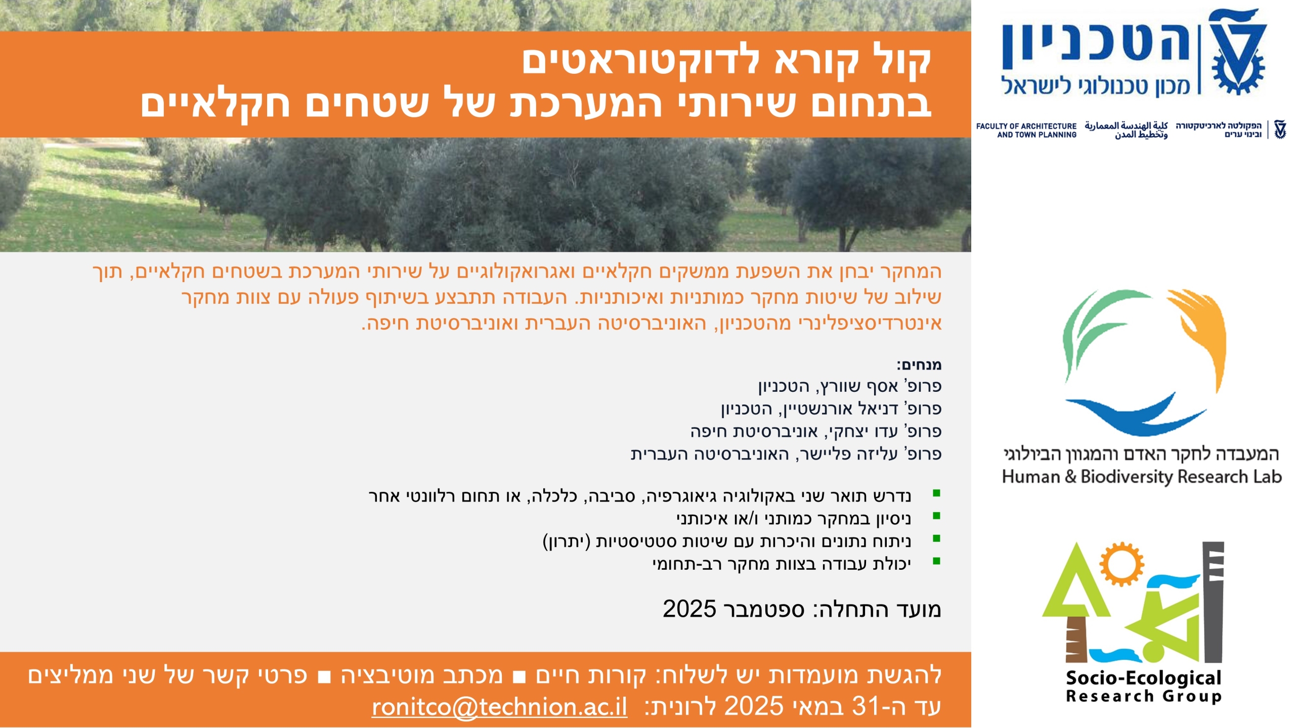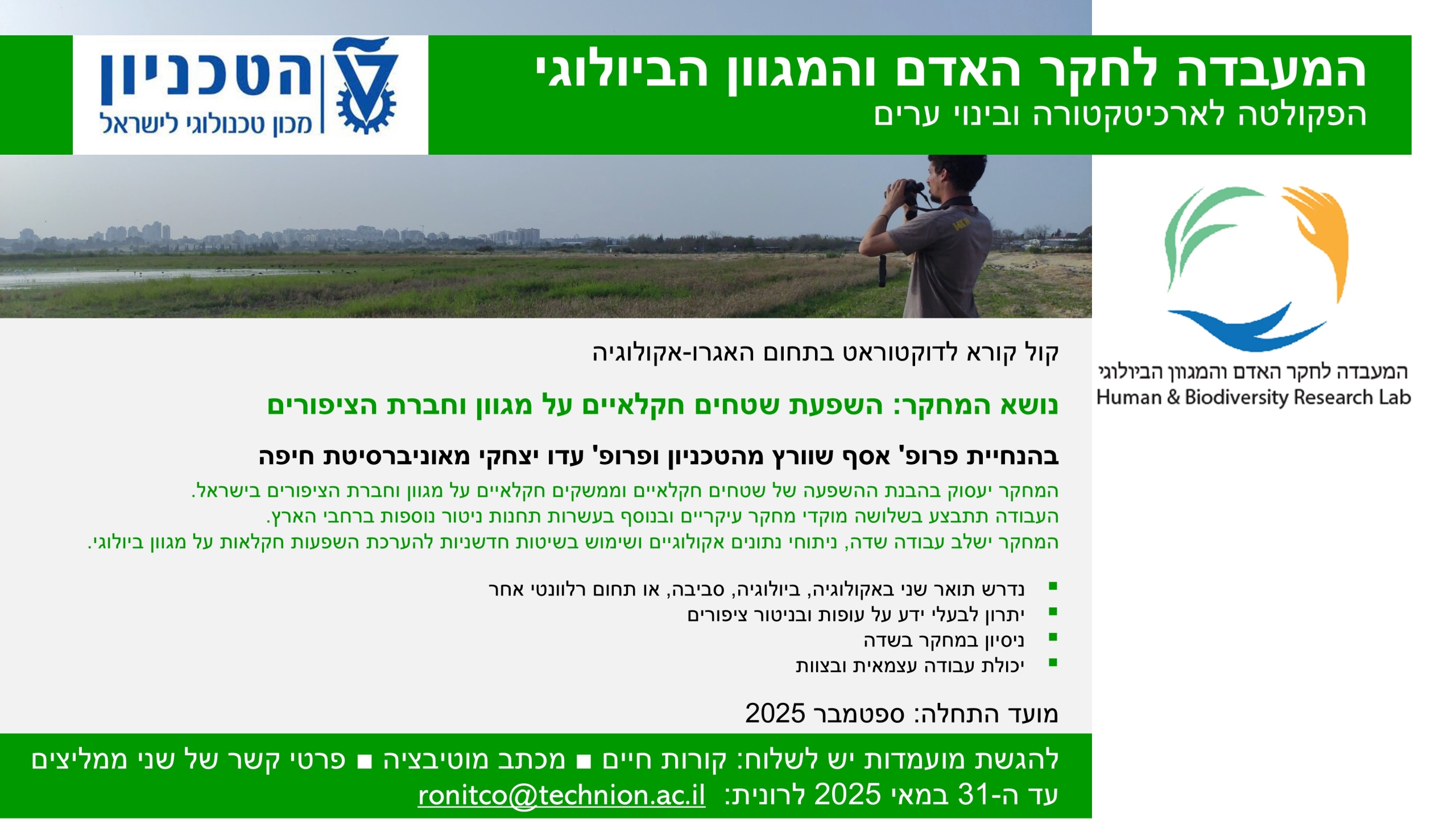 You are welcome to Join the Human and Biodiversity (HUB) lab at the Technion Institute of Technology We’re seeking a Postdoctoral Researcher with a strong background in spatial modeling (ideally with experience in systematic conservation planning or optimization modeling) to explore the social and ecological outcomes of Nature-based Solutions (NbS) for sustainable cities.